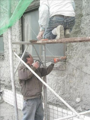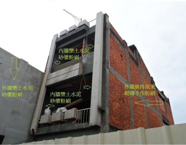 台灣三、四十年前民間新建的房屋, 大多數是加強磚造部分外牆僅砌磚, 未作水泥粉刷、貼磁磚或其他外飾。