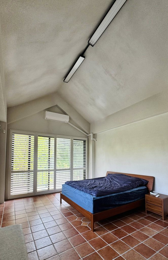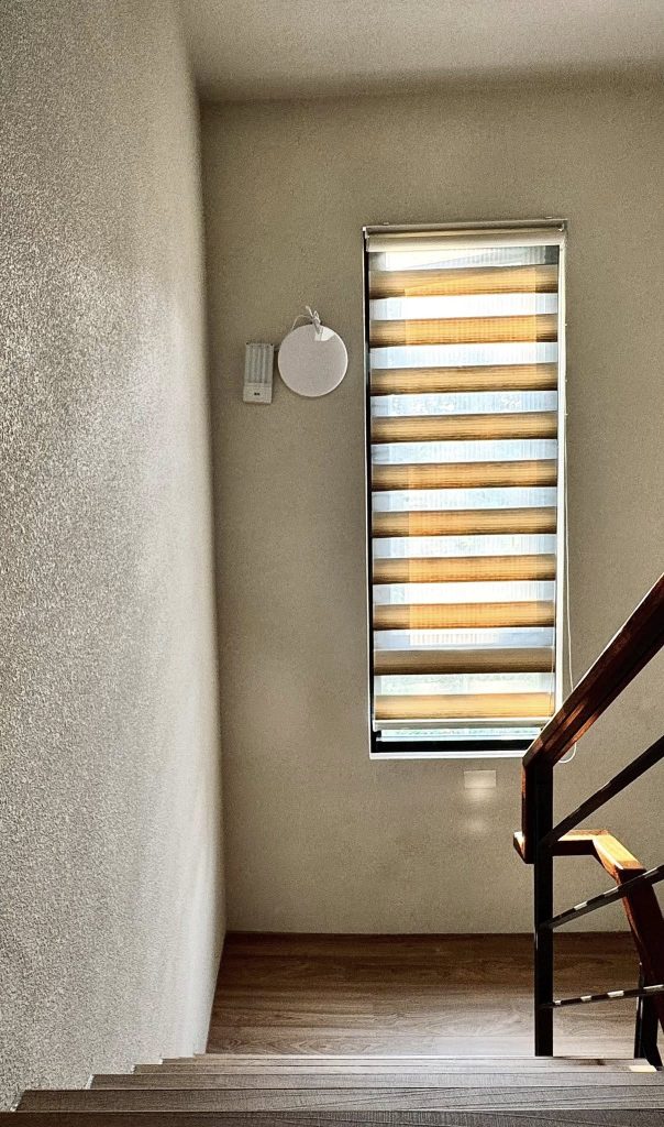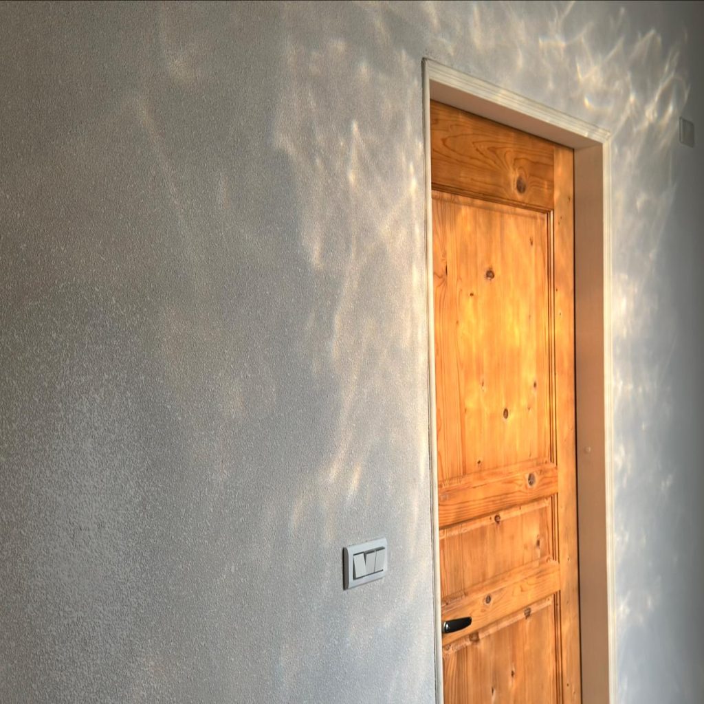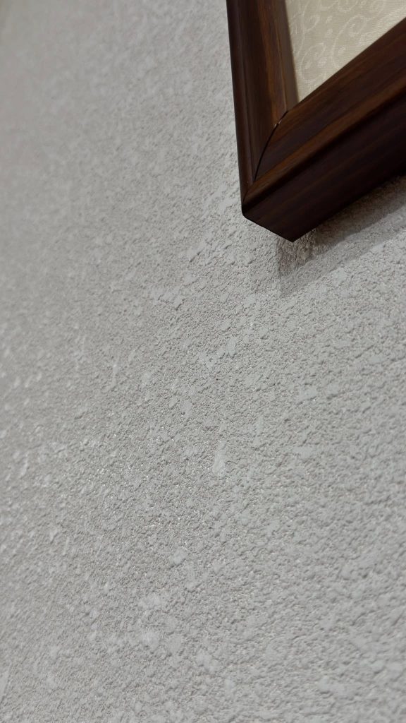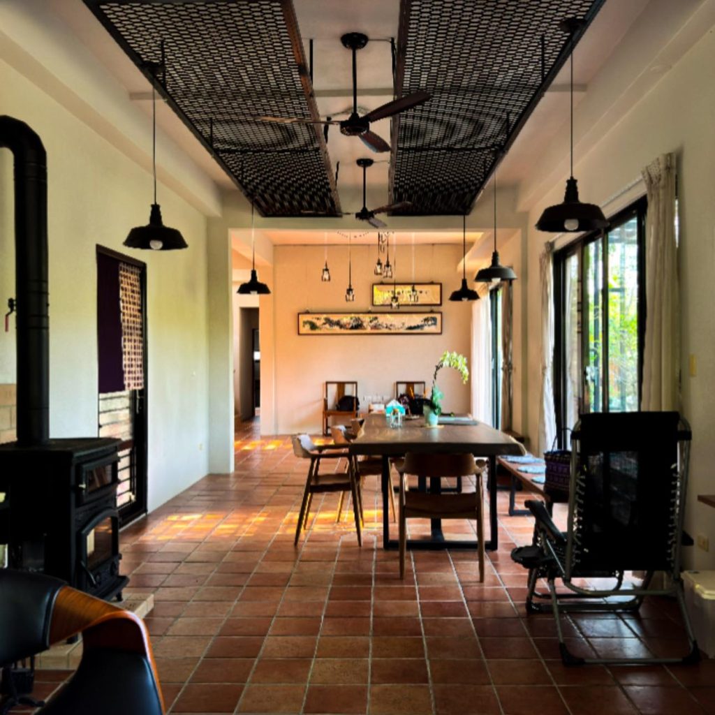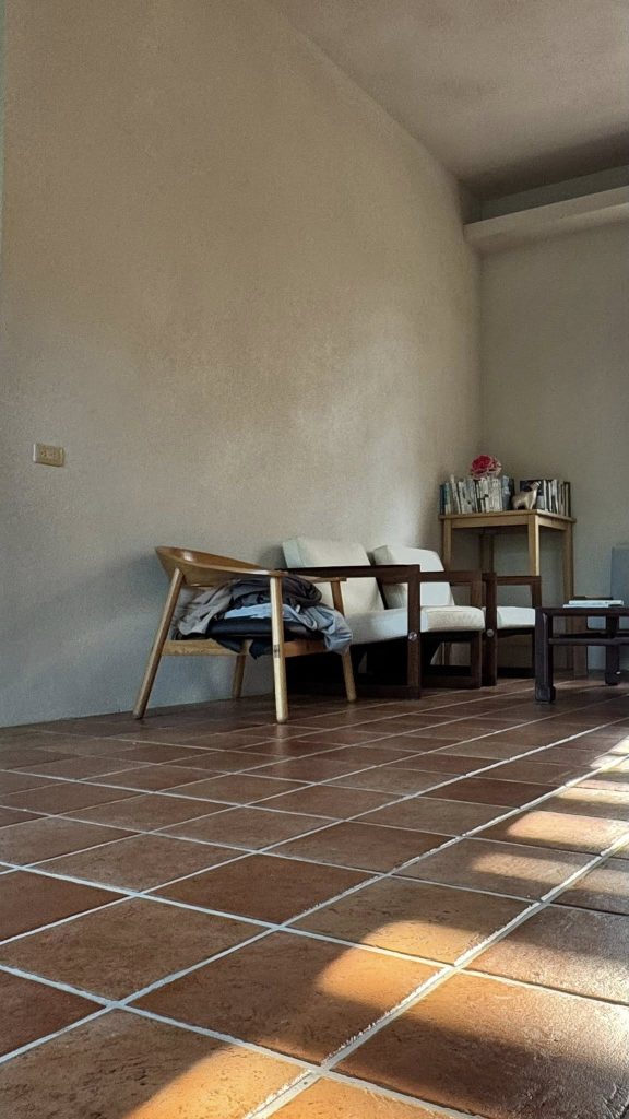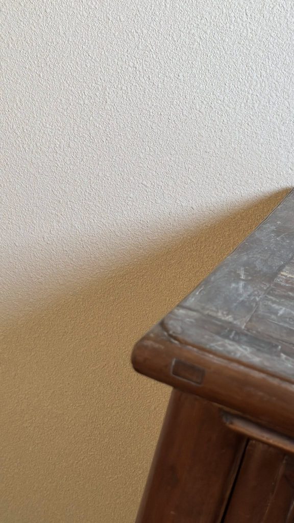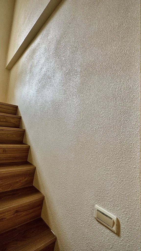 在這間「循環之屋」裡,大師兄發揮了極致工藝,將 「樂土細蚵灰泥」 搭配石頭漆噴槍 施作,打破了傳統塗料的框架,讓牆面呈現出如自然岩石般、帶有顆粒感的立體層次。