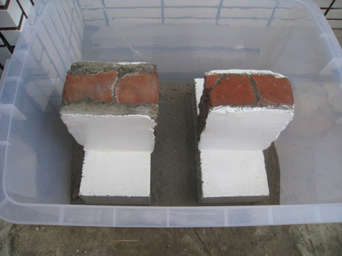 2.禹理論– 將紅磚用添加樂土防水粉的水泥砂漿砌於空心磚上