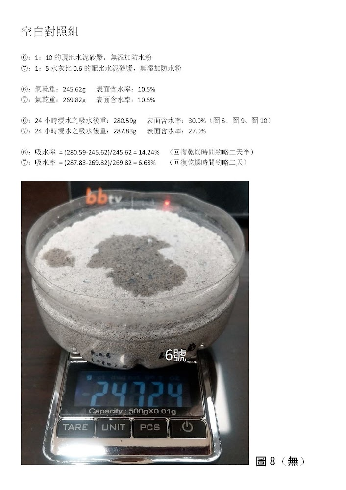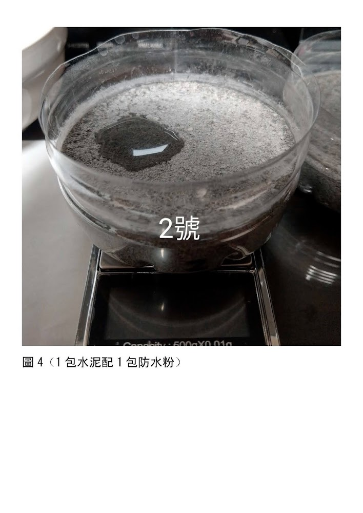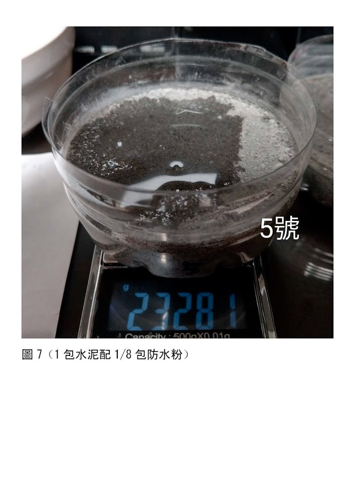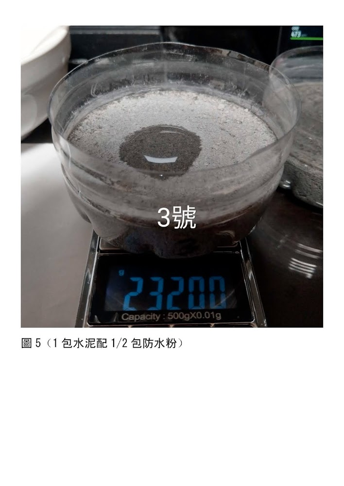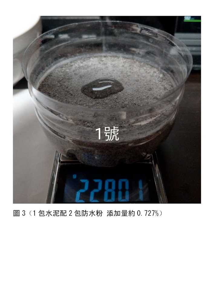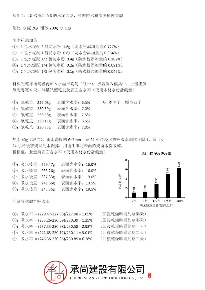 以下為承尚建設 吳承恩副總完整的實驗記錄, 根據這樣的實驗結果, 最後他們採用一包水泥添加1/3包樂土通用型多效能防水粉的方式, 三個指標分別是
